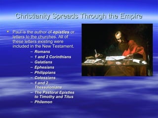 Christianity Spreads Through the Empire Christianity spread rapidly through out the Roman Empire The Apostle Paul He stressed that Jesus was the son of God and helped welcome all. Third it appealed to those who were bothered. The central figure of Christian religion.